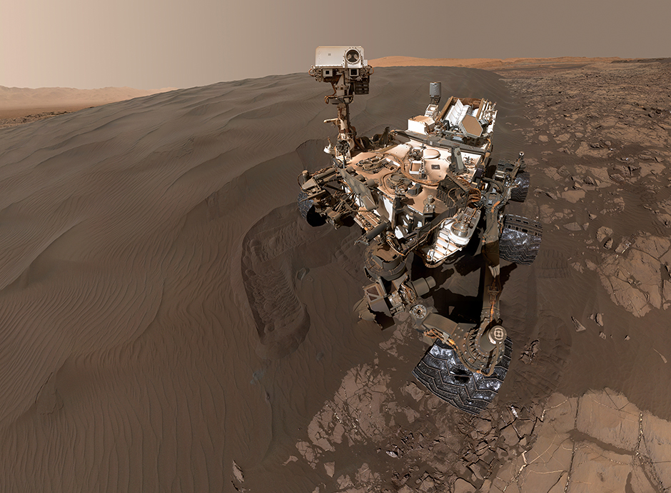 사진에서 큐리오시티(Curiosity)호가 맨송맨송한 사구에서 정류하면서 다음 명령을 기다리고 했다.