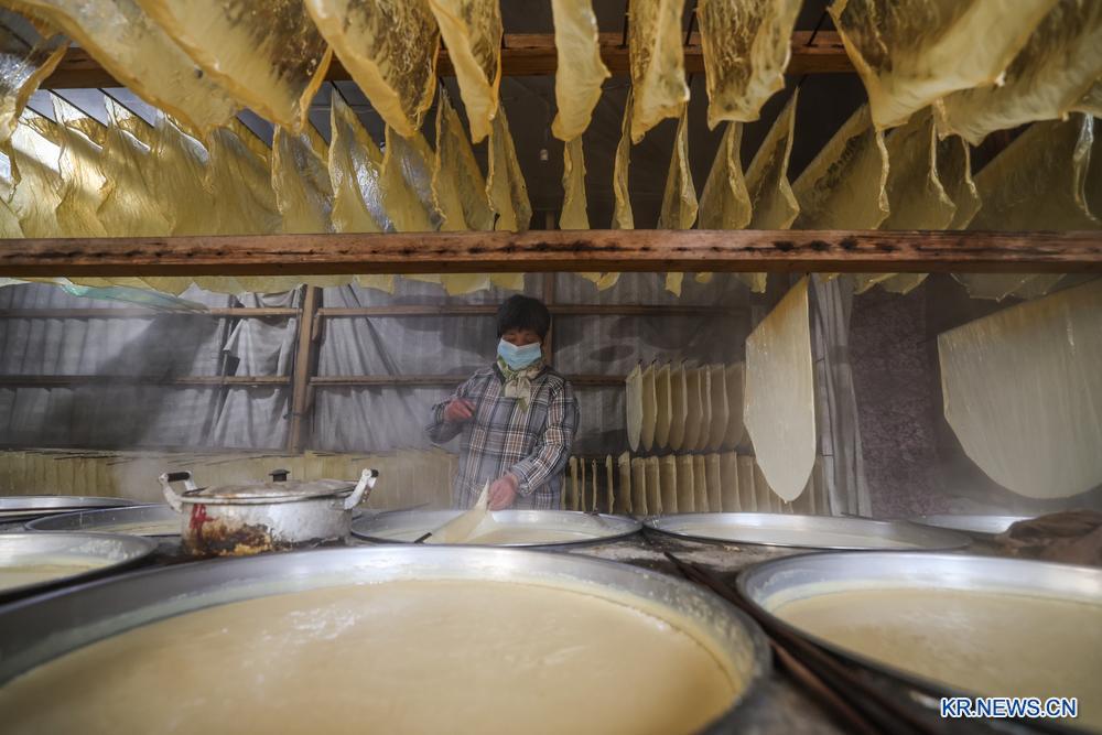 춘절(春節·음력설)이 다가오면서 저장(浙江)성 주지(諸暨)시 안화(安華)진의 두부피 생산도 성수기를 맞았다. 지역 주민들은 명절 기간 동안 원활한 공급을 위해 두부피 생산에 속도를 내고 있다.