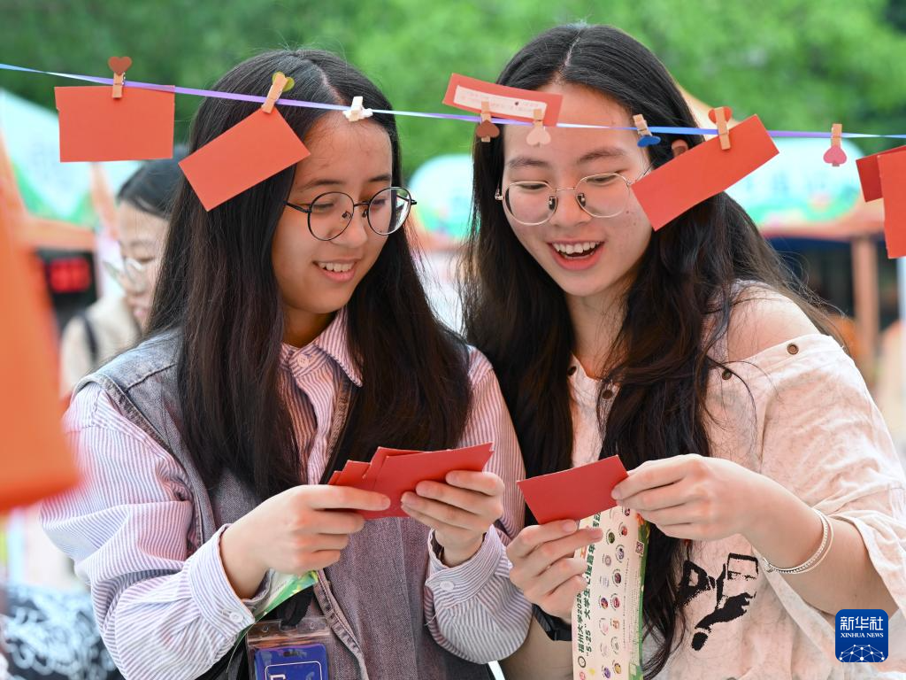 5월 25일, 푸저우대 심리 축제 행사에서 학생들이 심리 건강 지식 퀴즈 카드를 확인하고 있다. [신화사 강커훙 기자 촬영]