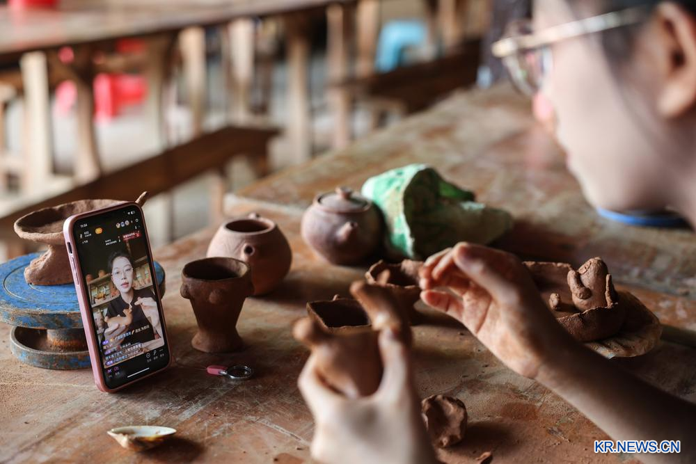 9일 하이난(海南)성 싼야(三亞)시 헤이투(黑土)촌의 한 합작사에서 주민 둥자자(董佳佳)가 라이브방송으로 리(黎)족 전통 도자기 제품을 판매하고 있다.