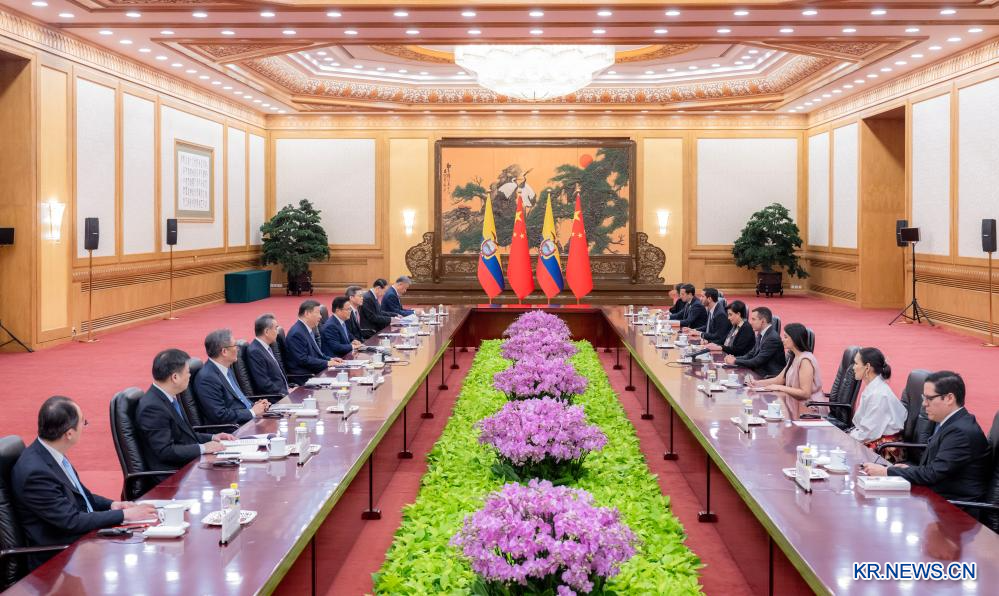 시진핑(習近平) 중국 국가주석이 27일 오전 베이징 인민대회당에서 '세계경제포럼 제16회 신흥 글로벌 챔피언 연차총회(2025 하계 다보스포럼)' 참석차 중국을 방문 중인 다니엘 노보아 에콰도르 대통령과 회견했다.[촬영/신화사 기자 자이젠란(翟健岚)]