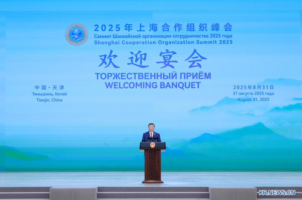 시진핑(習近平) 중국 국가주석과 부인 펑리위안(彭麗媛) 여사가 31일 저녁 톈진(天津) 메이장(梅江)국제컨벤션센터에서 연회를 열어 '2025년 상하이협력기구(SCO) 정상회의' 참석차 중국을 방문한 해외 귀빈을 환영했다.사진은 축사를 하는 시 주석.[촬영/신화사 기자 딩하이타오(丁海濤)]