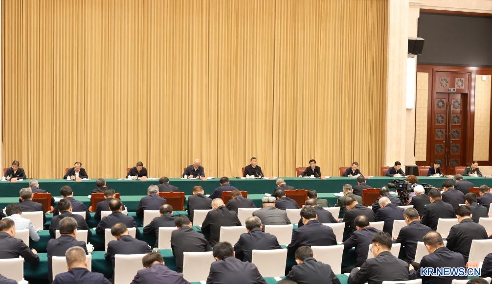 중앙대표단을 이끌고 신장위구르자치구 설립 70주년 경축행사에 참석한 시진핑(習近平) 중국 공산당 중앙위원회 총서기, 국가주석, 중앙군사위원회 주석은 24일 오후 우루무치(烏魯木齊)에서 신장위구르자치구 당위원회와 정부의 업무 보고를 청취하고 중요 연설을 했다.[촬영/신화사 기자 딩린(丁林)]