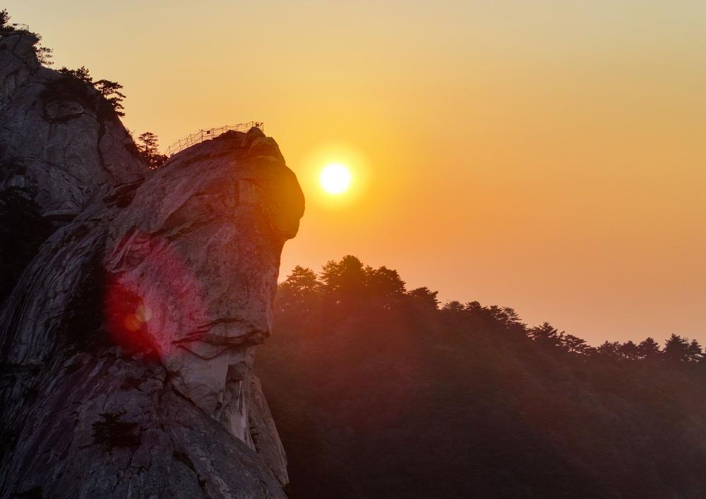 가을 아침 떠오르는 태양이 후베이(湖北)성 마청(麻城)시 구이펑산 관광지의 봉우리와 암석을 비추며 웅장한 경관이 연출됐다.