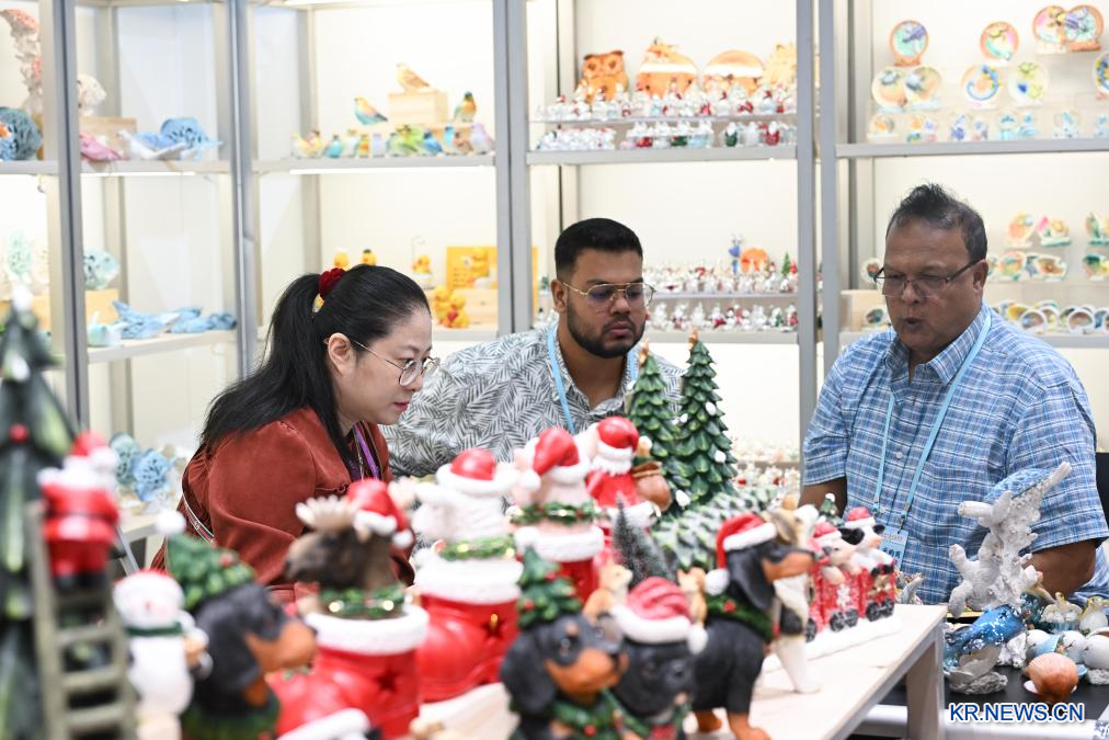 '제138회 중국수출입박람회(캔톤페어)' 2기 행사가 23일 개막했다. 홈퍼니싱을 주제로 ▷가정용품 ▷선물·장식품 ▷건축자재·가구 3개 섹션으로 구성됐으며, 1만 개 이상 기업이 참가했다.이날 장식품 전시 부스에서 상담하는 해외 바이어.