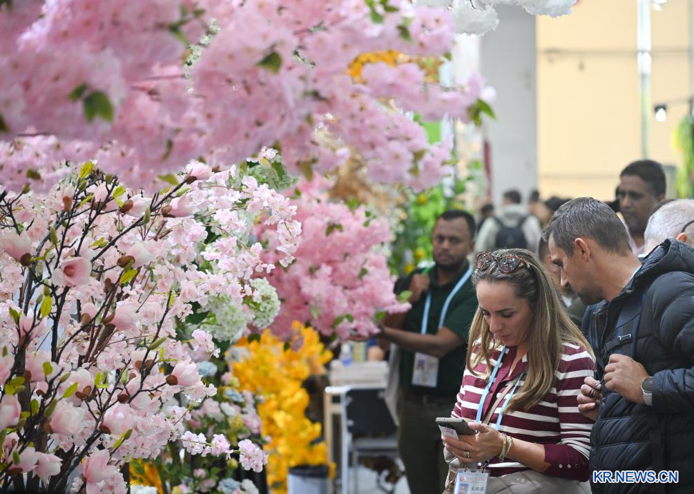'제138회 중국수출입박람회(캔톤페어)' 2기 행사가 23일 개막했다. 홈퍼니싱을 주제로 ▷가정용품 ▷선물·장식품 ▷건축자재·가구 3개 섹션으로 구성됐으며, 1만 개 이상 기업이 참가했다.이날 조화 전시 부스를 살펴보는 바이어.