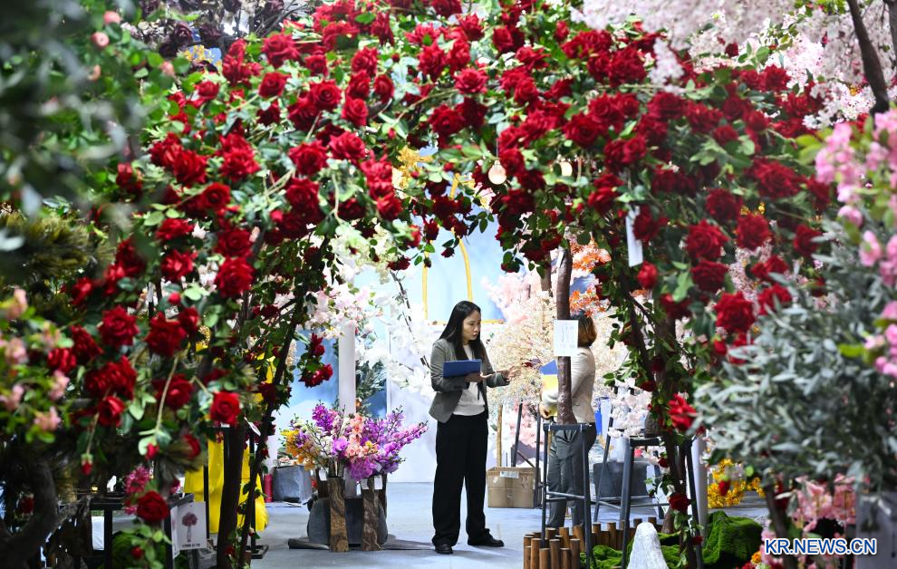 '제138회 중국수출입박람회(캔톤페어)' 2기 행사가 23일 개막했다. 홈퍼니싱을 주제로 ▷가정용품 ▷선물·장식품 ▷건축자재·가구 3개 섹션으로 구성됐으며, 1만 개 이상 기업이 참가했다.이날 조화 전시 부스에서 상담하는 관계자.