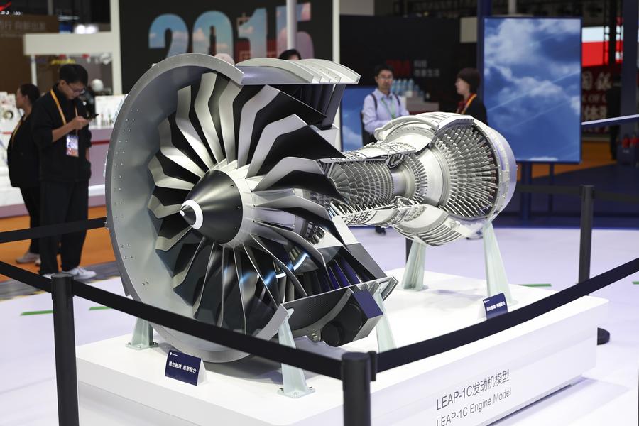 지난 7일 기술 장비 전시 구역의 GE에어로스페이스 부스에서 LEAP-1C 엔진 모델이 중국에서 처음으로 전시됐다. GE에어로스페이스는 8년 연속 중국국제수입박람회(CIIE)에 참가하고 있다. (사진/신화통신)