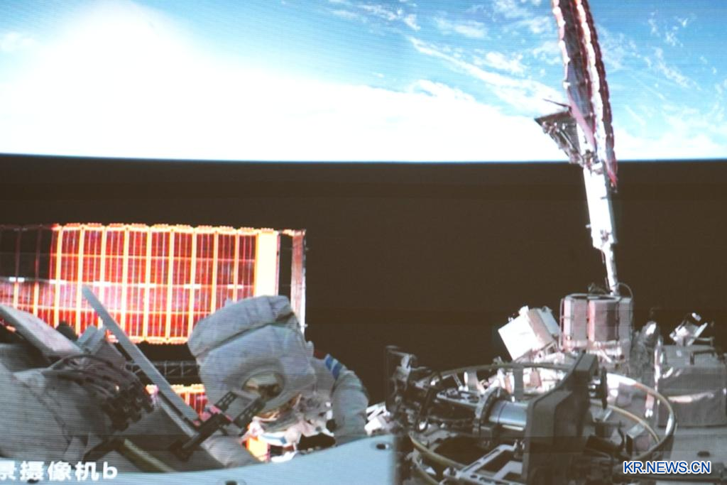 중국유인우주공정판공실(CMSEO)에 따르면 9일 오후 6시45분 약 8시간에 걸친 우주유영을 통해 선저우(神州) 21호 승무원 장루(張陸), 우페이(武飛), 장훙장(張洪章)이 긴밀히 협력해 첫 우주유영을 원만히 완수하고, 선저우 20호 우주선의 귀환 캡슐 창문 순찰 및 사진 촬영 등의 임무도 완수했다.[촬영/신화사 기자 류이(劉藝)]