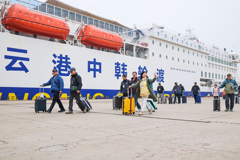 2025년 2월 2일, 장쑤(江蘇)성 롄윈강(連雲港)항 하이강(海港) 국제여객터미널에 하선한 한국인 관광객들이 입국 대합실로 향하고 있다. 사진/VCG