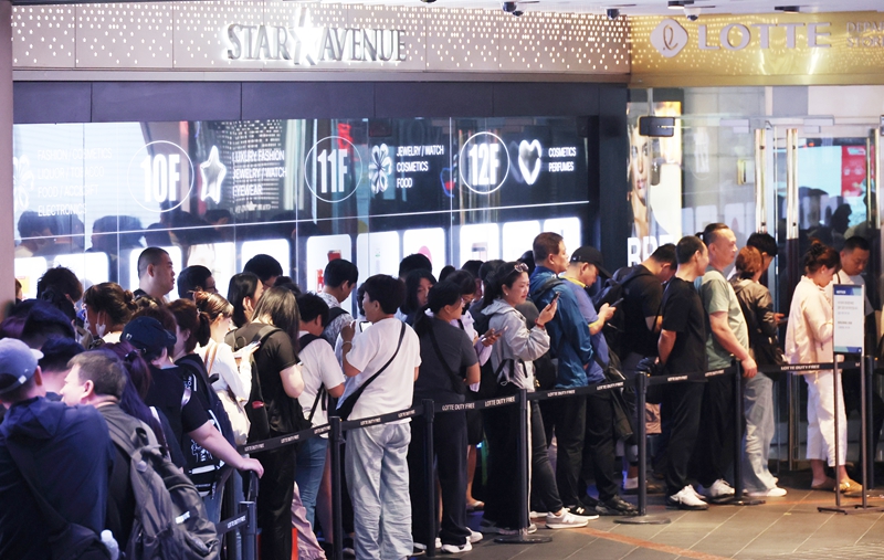 2025년 6월 9일, 한국 서울의 한 면세점 앞에서 관광객들이 입장을 기다리며 줄을 서고 있다. 그중 대다수는 중국인 관광객이다. 사진/VCG