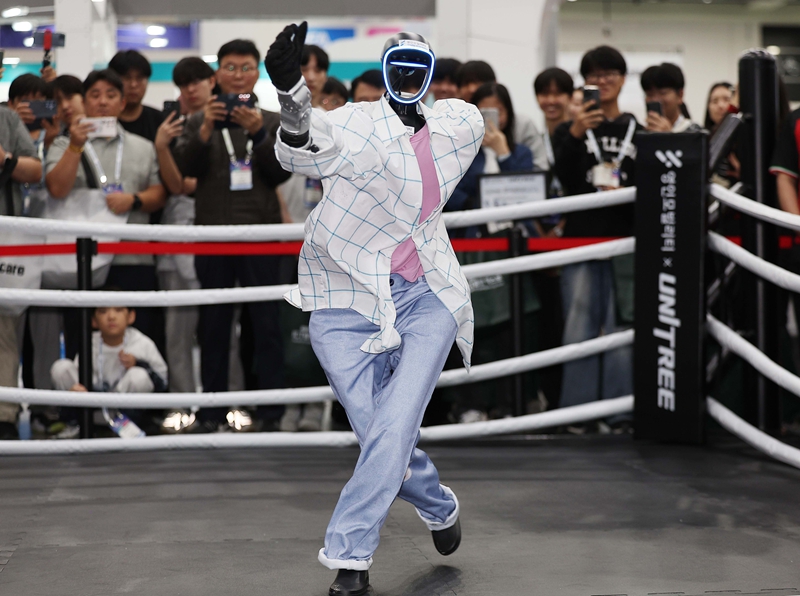 2025년 10월 22일 한국 대구 북구 엑스코에서 2025 대구 국제로봇 산업전이 열렸다. 드론·로봇 솔루션 전문기업 영인 모빌리티 부스에서 중국 로봇 기업 위수커지(宇樹科技, 유니트리)가 개발한 휴머노이드 로봇이 아이돌 댄스를 선보이고 있다. 사진/VCG