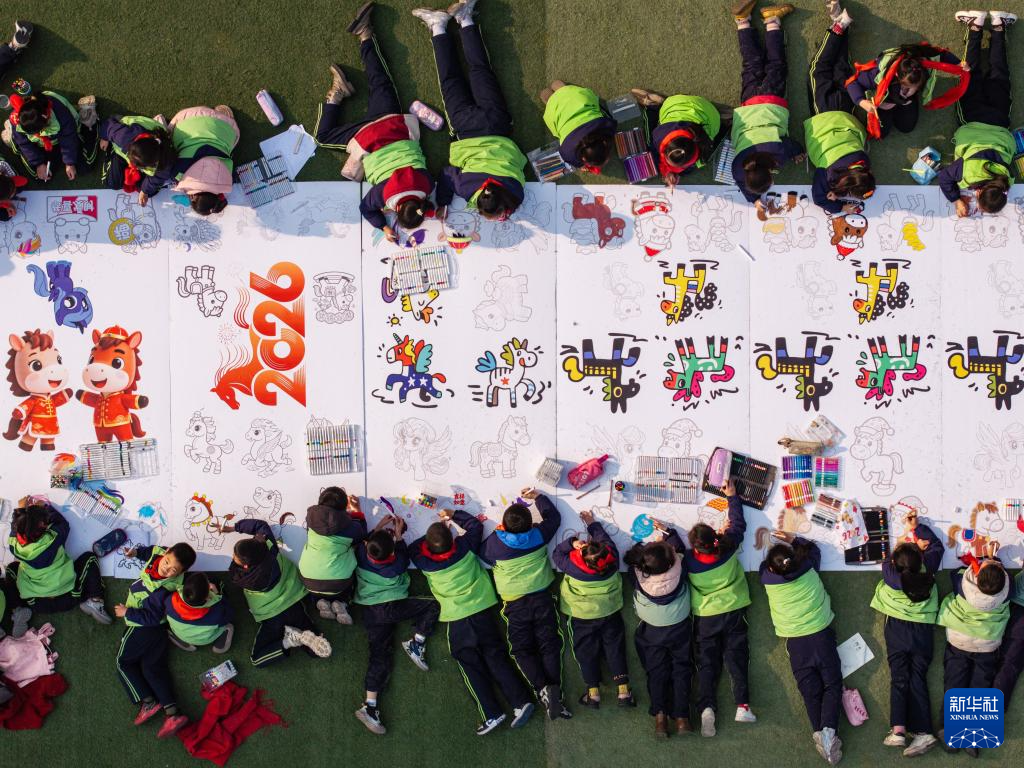 14일 쓰촨(四川)성 쯔궁(自貢)시 룽(榮)현의 한 초등학교 운동장에서 교사와 학생들이 거대한 '마(馬)'자 윤곽의 캔버스에 다양한 방식으로 말을 그려냈다.