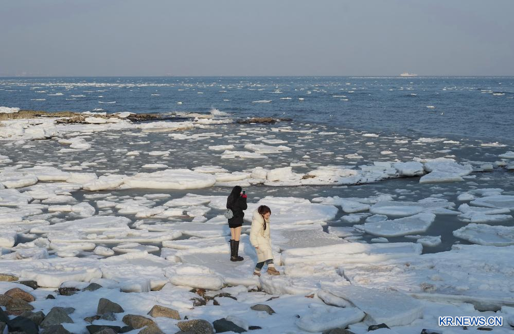 친황다오시의 해안선을 따라 결빙이 진행되자 이를 감상하려는 여행객의 발길이 이어졌다.