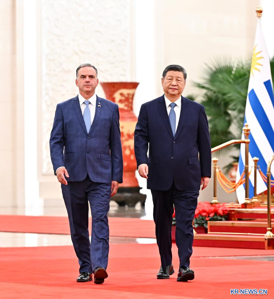 시진핑(習近平) 중국 국가주석이 3일 오전 베이징 인민대회당에서 중국을 국빈 방문한 야만두 오르시 우루과이 대통령과 회담했다. 회담에 앞서 시 주석은 인민대회당 북대청(北大廳)에서 오르시 대통령을 위해 환영식을 준비했다.[촬영/신화통신 기자 옌옌(燕雁)]