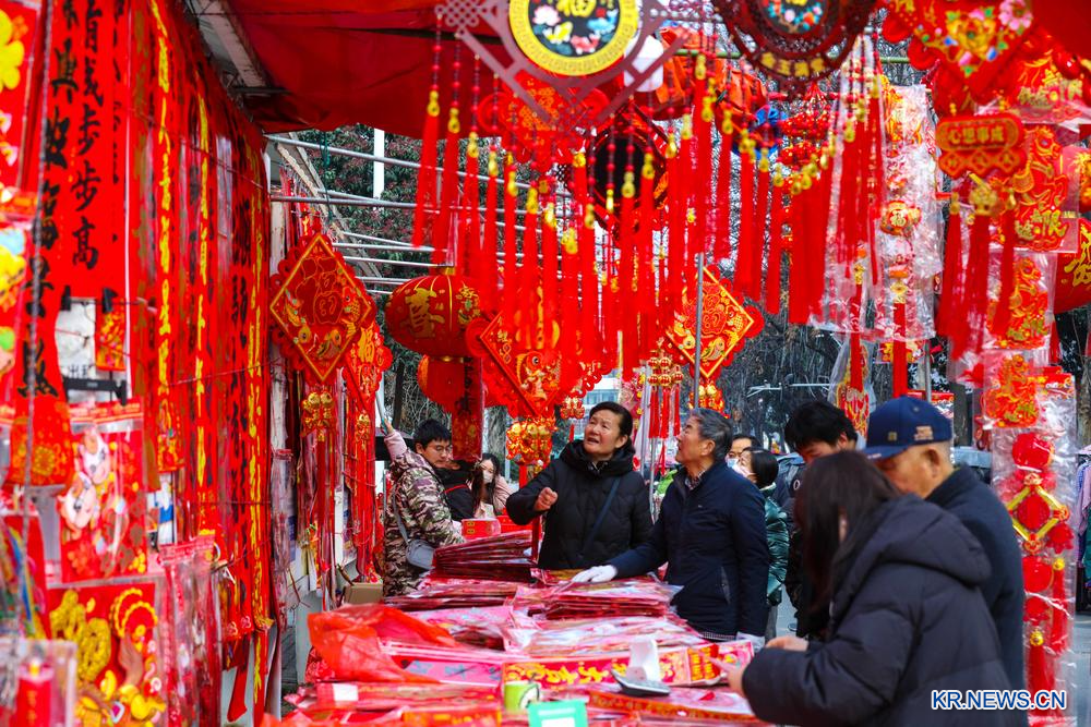 5일 허난(河南)성 신양(信陽)시 광산(光山)현의 한 시장에서 춘절 장식품을 구매하는 시민들.