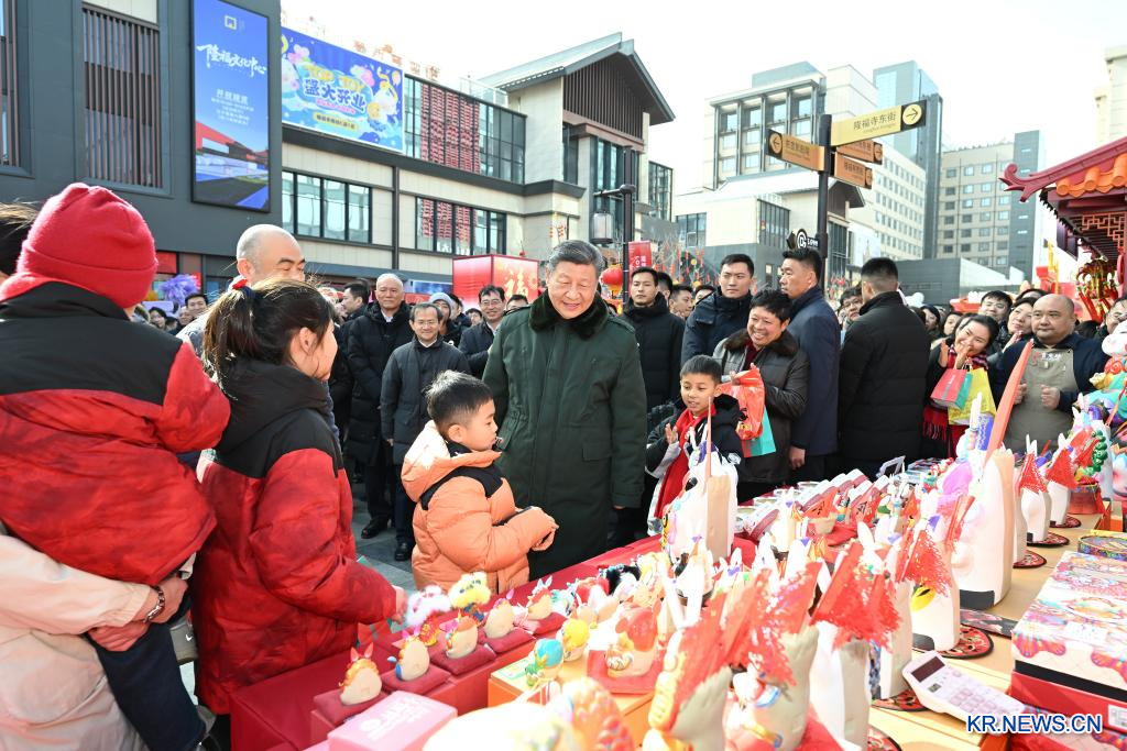 10일 오전 둥청구 룽푸쓰 거리의 한 시장을 방문해 현장 주민들과 담소를 나누고 있는 시 주석.