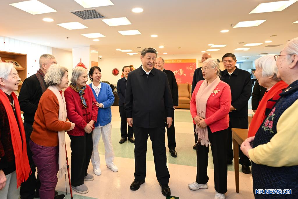 10일 오전 시청구의 한 노인 아파트 단지를 방문해 노인들과 담소를 나누고 있는 시 주석.