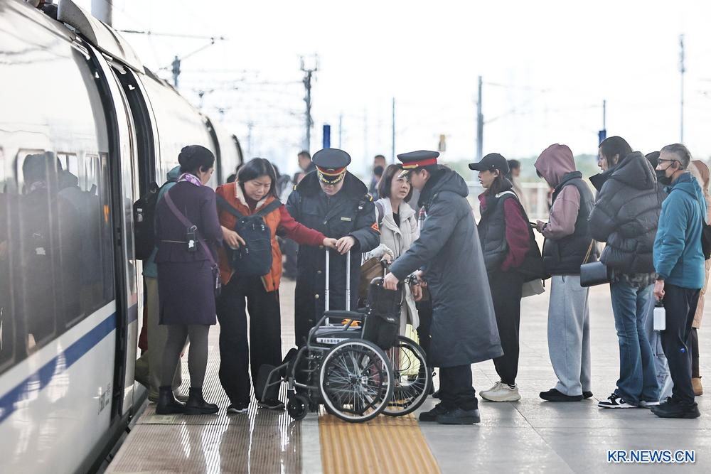 19일 저장(浙江)성 자싱(嘉興)남역 승강장에서 직원이 다리를 다친 승객을 도와 휠체어에 태우고 안전하게 역을 빠져나올 수 있도록 서비스를 제공하고 있다.