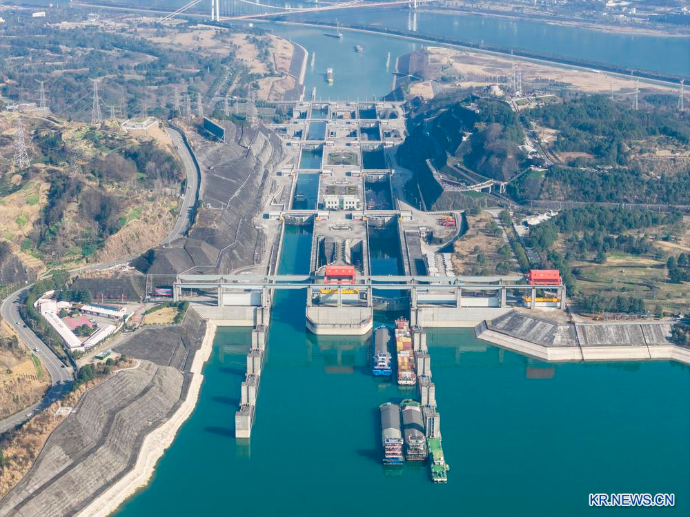 19일 후베이(湖北)성 이창(宜昌)시에서 선박들이 창장(長江) 싼샤(三峽) 쌍선(雙線) 5급 갑문을 통과하는 모습을 드론으로 내려다봤다.