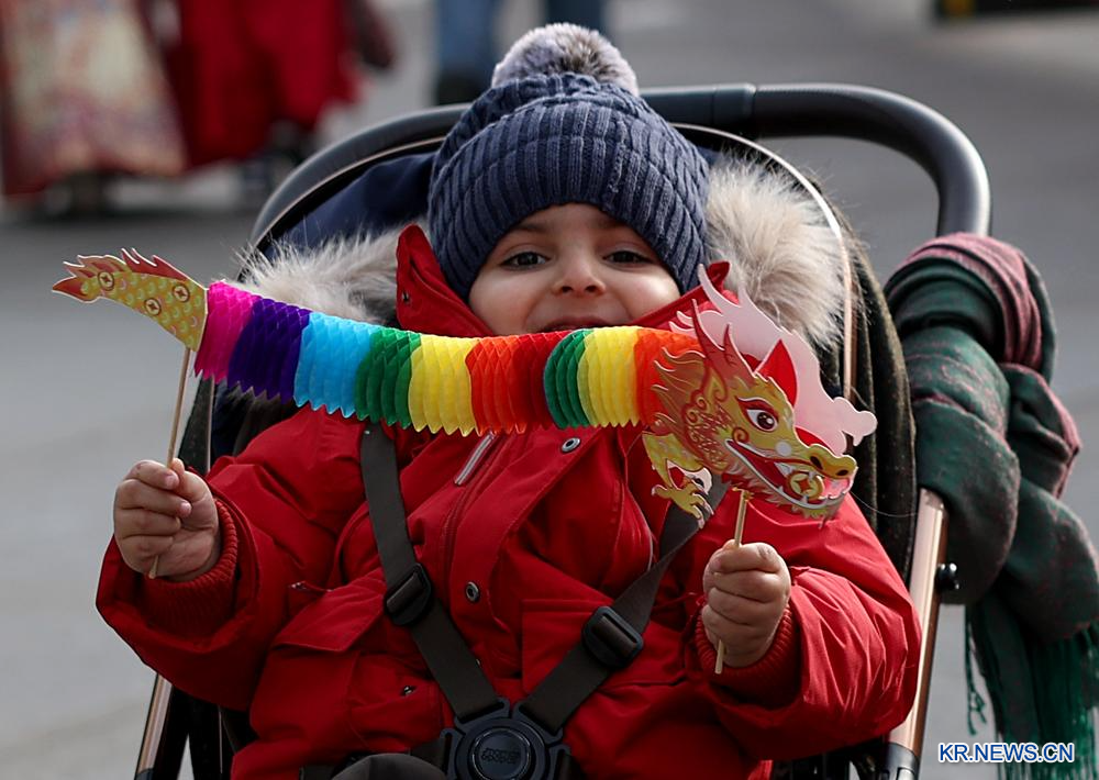 한 어린이가 22일 영국 런던 중심부의 트라팔가 광장에서 열린 중국 춘절(春節·음력설) 축제에 참여하고 있다.