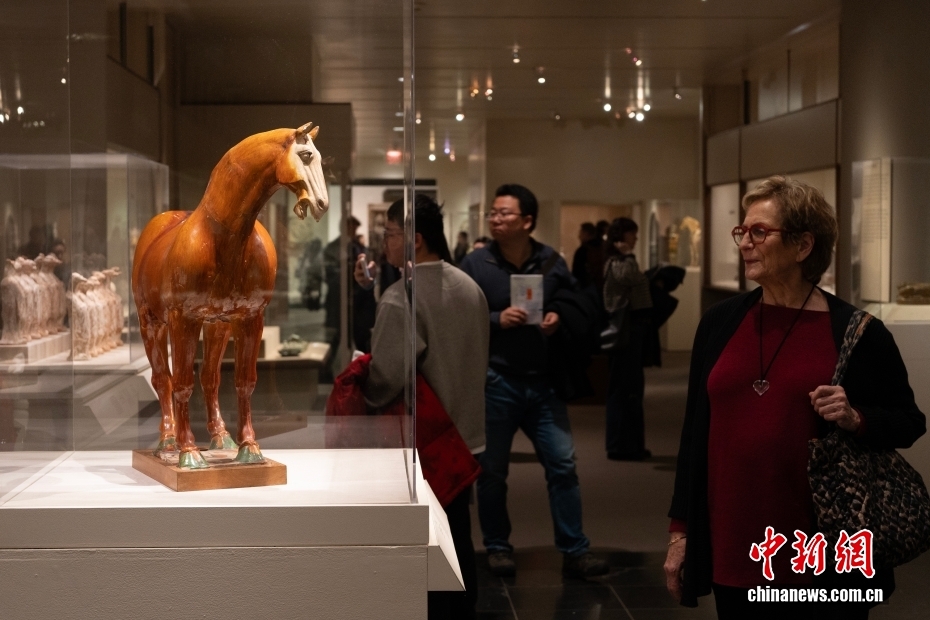 현지시간 2월 26일, 미국 뉴욕 메트로폴리탄 미술관에서 관람객이 '당나라 갈색 유약 말모양 도기'을 감상하고 있다. [중신사 랴오판 기자 촬영]