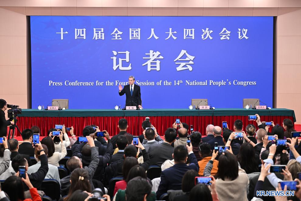 제14기 전인대(전국인민대표대회) 4차 회의 외교 주제 기자회견이 8일 오전 10시 미디어센터 프레스룸에서 개최됐다. 이날 기자회견에 참석한 왕이 중국공산당 중앙정치국 위원 겸 외교부장은 '중국 외교정책과 대외관계' 주제와 관련해 국내외 기자들과 질의응답을 진행했다.