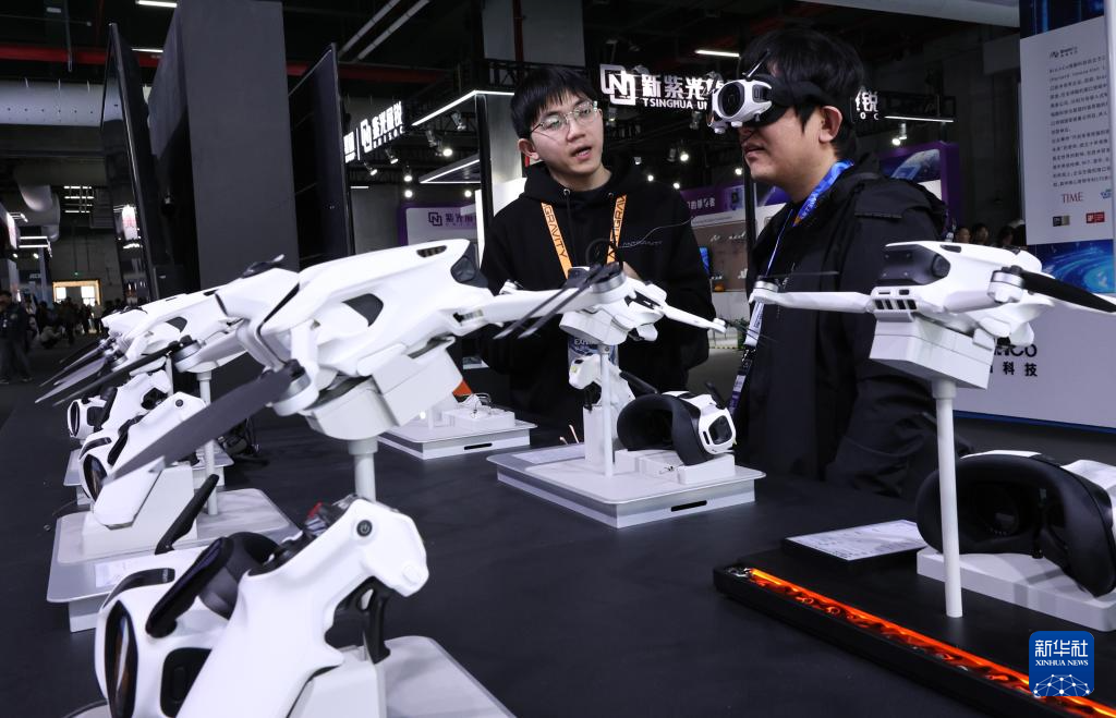 3월 12일, 한 방문객이 둥팡허브 전시 구역에서 스마트 안경을 착용하고 전경 비행체 시점 체험을 하고 있다. [신화사 팡저 기자 촬영]