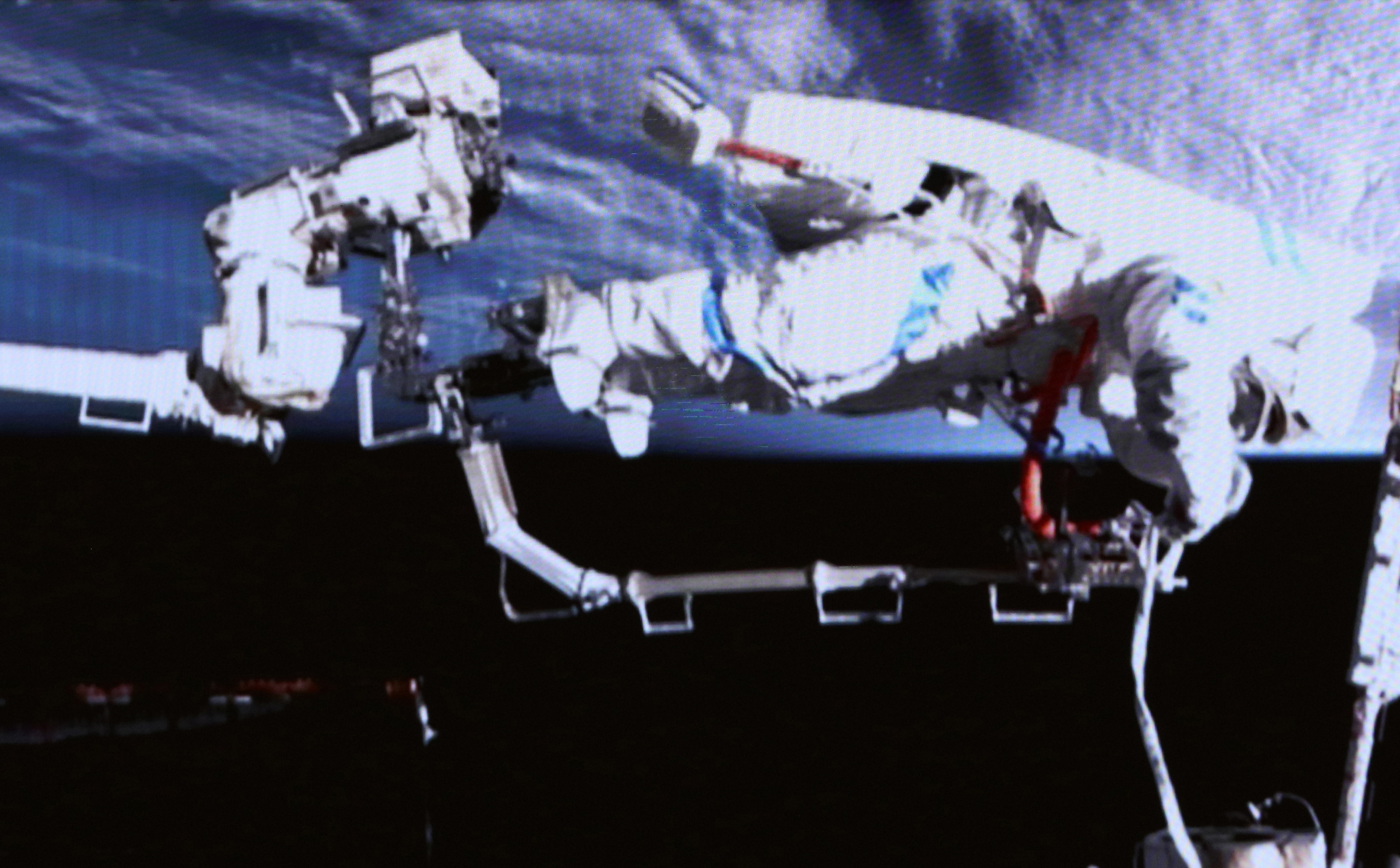 16일 선저우 21호 우주인의 선외 활동 장면이 베이징우주통제센터(BACC) 스크린에 포착됐다.