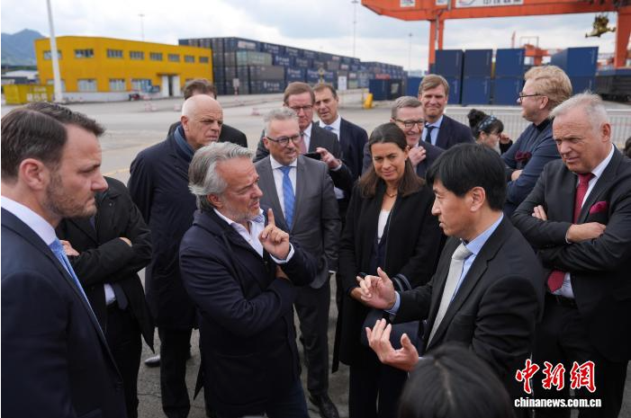 3월 18일, 독일 기업 CEO 시찰단이 충칭시 사핑바구에 위치한 충칭철도컨테이너센터역을 방문해 시찰하고 있다. [중신사 허펑레이 기자 촬영]