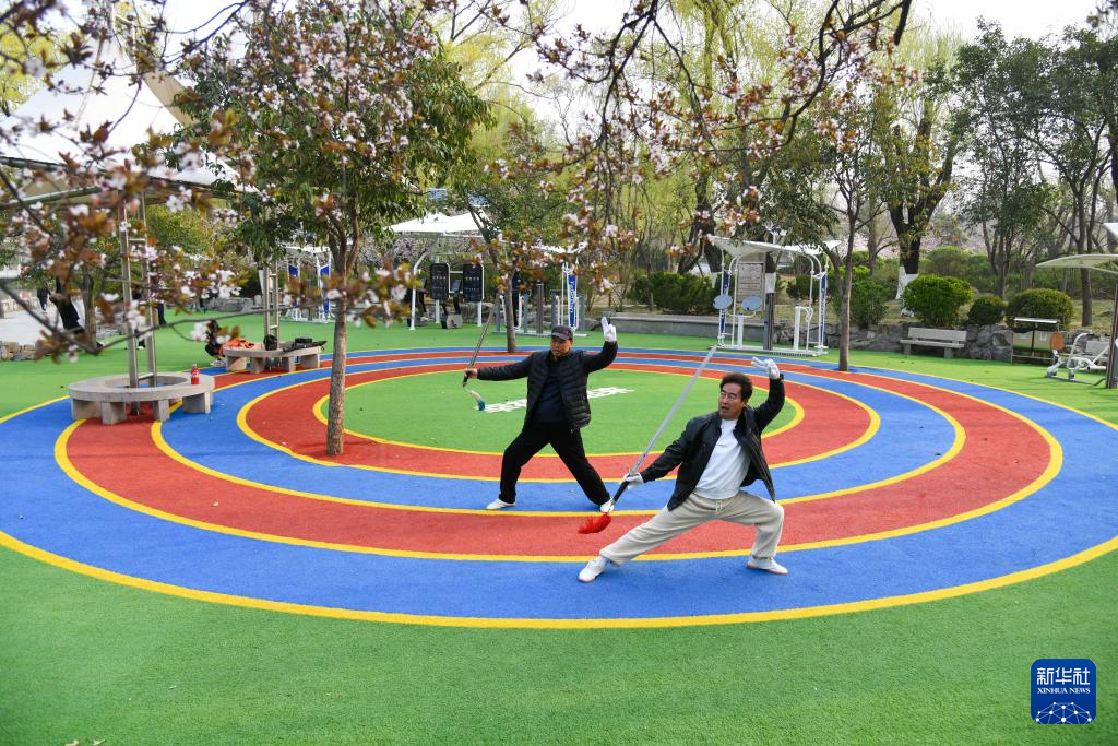 22일 지난시 취안청(泉城)공원에서 태극검을 수련 중인 운동 애호가들
