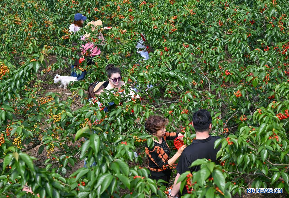 이날 윈우산앵두밸리에서 앵두를 따고 있는 여행객.