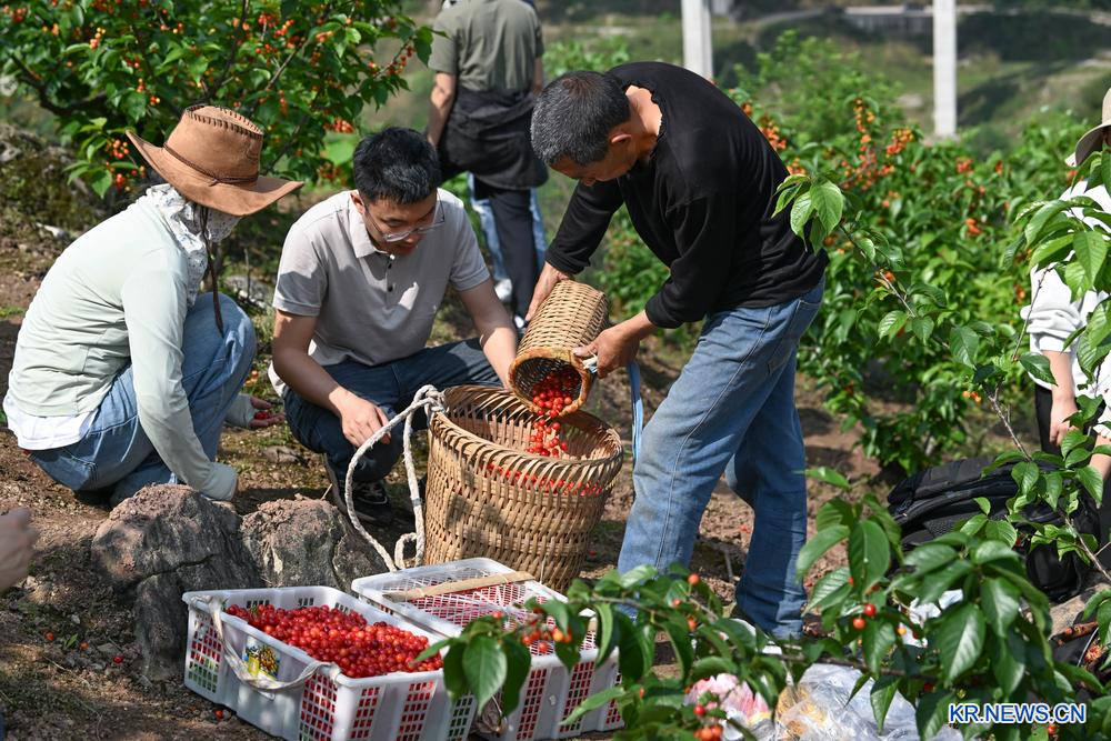 9일 여행객이 충칭(重慶)시 윈우산(雲霧山)앵두밸리에서 앵두를 구매하고 있다.