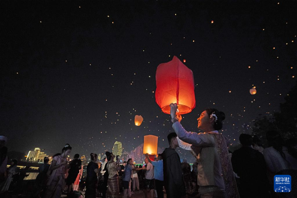 13일 저녁, 관광객과 현지 주민들이 윈난(雲南)성 시솽반나(西雙版納) 다이(傣)족자치주 징훙(景洪)시 란창(瀾滄)강 강변에서 함께 축복을 담은 공명등(孔明燈)을 날렸다. 하늘로 솟은 등불은 강물의 물결과 어우러져 장관을 이뤘다.