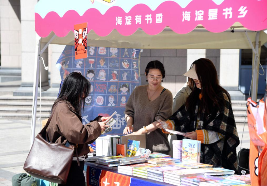 4월 20일, 베이징대학에서 한 학생(윈쪽)이 '옛 책에서 새 지식을·독서를 통한 교육' 제하 행사 현장에서 책을 고르고 있다. [신화사 런차오 기자 촬영]