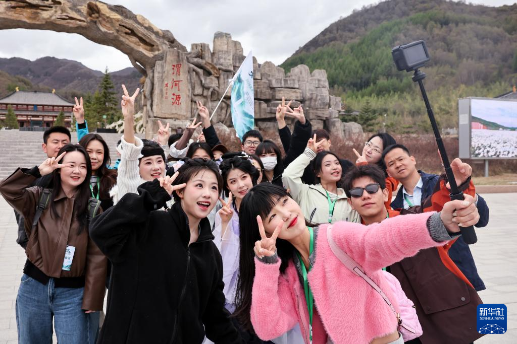 4월 27일, 문화·관광 콘텐츠 크리에이터들이 간쑤성 딩시시 웨이허위안 관광지에서 인증 사진을 찍고 있다.