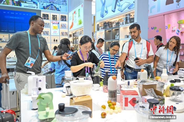 주방용품 전시 업체 관계자(왼쪽 두 번째)가 경외 바이어들에게 제품을 소개하고 있다. [중신사 천지민 기자 촬영]