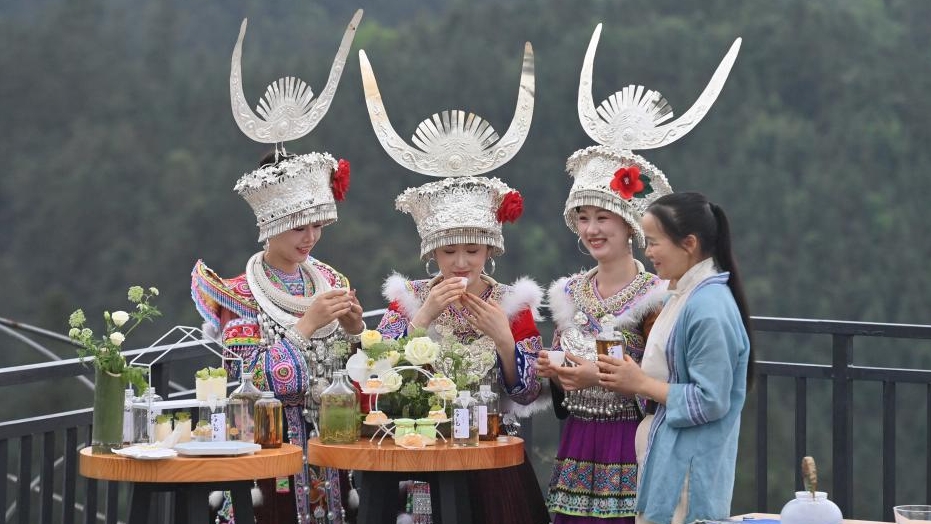 12일 광시(廣西)좡족자치구 류저우(柳州)시 룽수이(融水)먀오(苗)족자치현의 한 웨구이(粵桂∙광둥-광시) 합작 현대농업산업단지에서 사람들이 차(茶)를 마시고 있다...