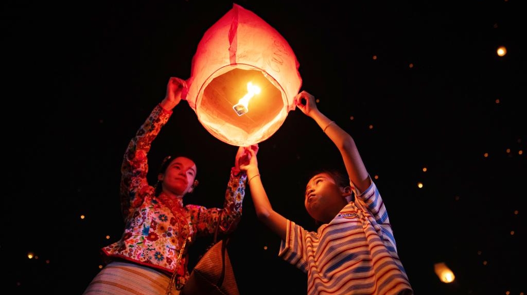 13일 저녁, 관광객과 현지 주민들이 윈난(雲南)성 시솽반나(西雙版納) 다이(傣)족자치주 징훙(景洪)시 란창(瀾滄)강 강변에서 함께 축복을 담은 공명등(孔明燈)을 날렸다...